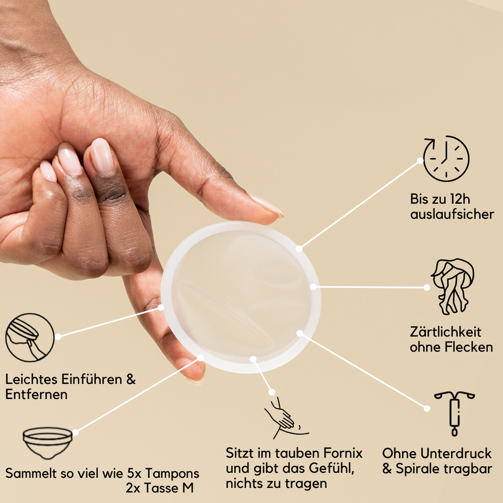 Du wirst das ultra-weiche Silikon der Scheibe lieben - es hält bis zu 5 Tampon-Mengen an Flüssigkeit (50 ml) - während ein fester doppelten Rand Undichtigkeiten und Gerüchen vorbeugt.