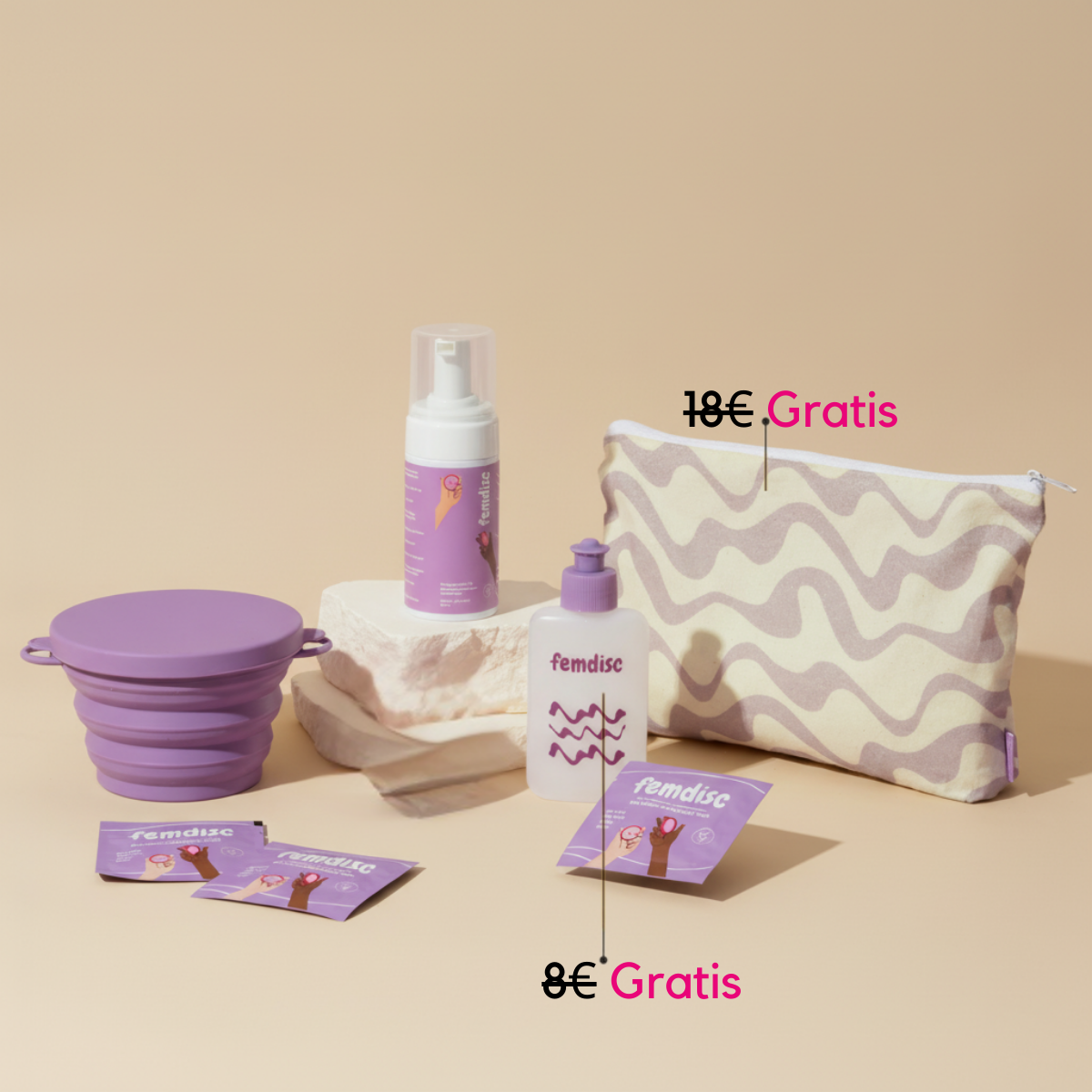 Das femdisc Reise-Kit passt in jede Handtasche und ermöglicht eine diskrete Reinigung deiner Menstruationsprodukte, ohne ein Waschbecken benutzen zu müssen.